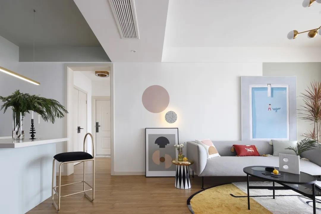 沙發墻潔凈的墻面加入白色與灰色的雙色設計,掛放一幅極簡的掛畫,左側還有兩盞圓形的壁燈。灰色布藝沙發,還有鮮艷活