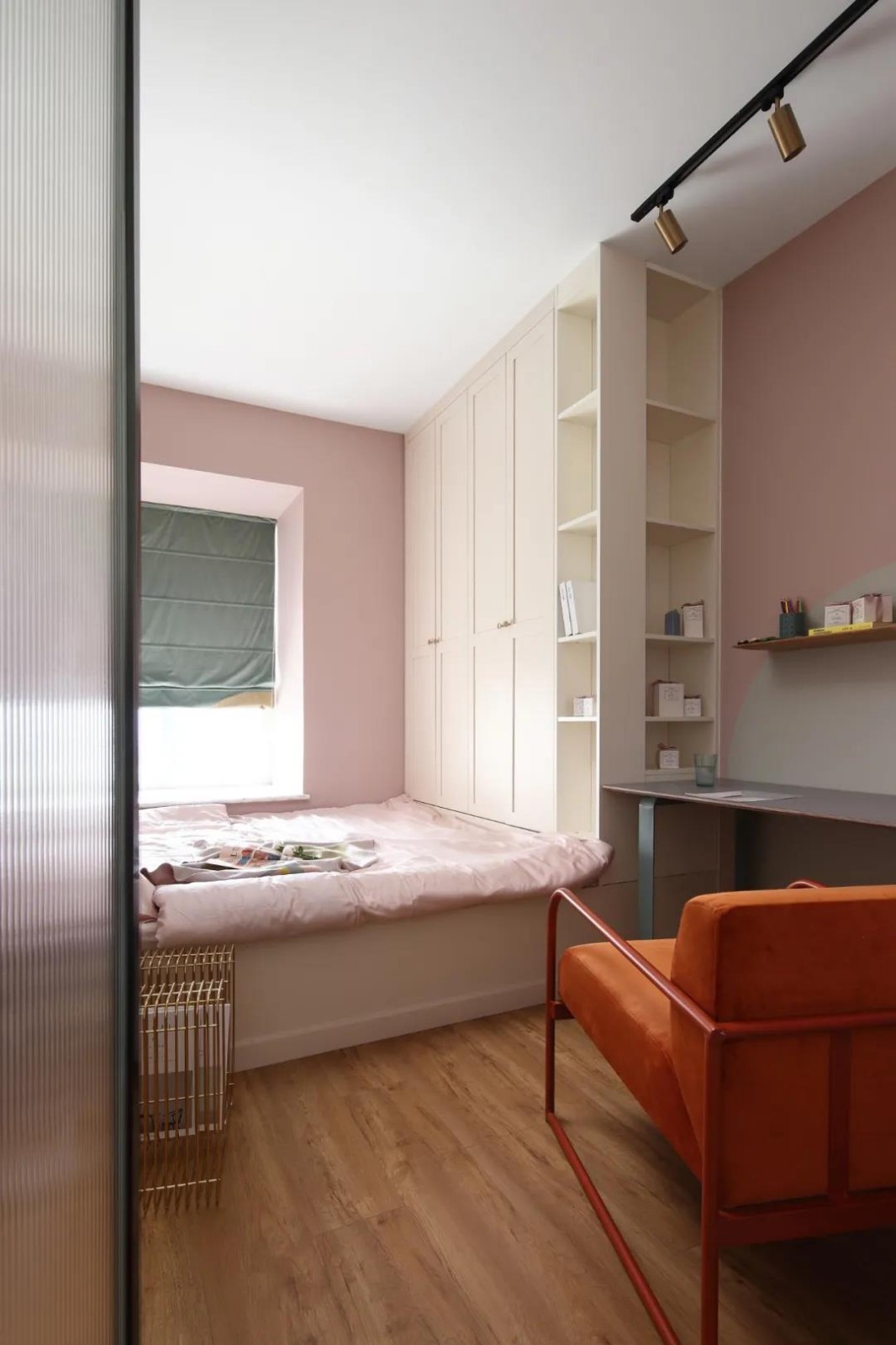 書房在粉色的墻面空間下,布置粉色床單,以象牙白的定制榻榻米、衣柜相呼應,在書桌旁邊的衣柜加入開放書架,整體空間的收納更加實用靈活。